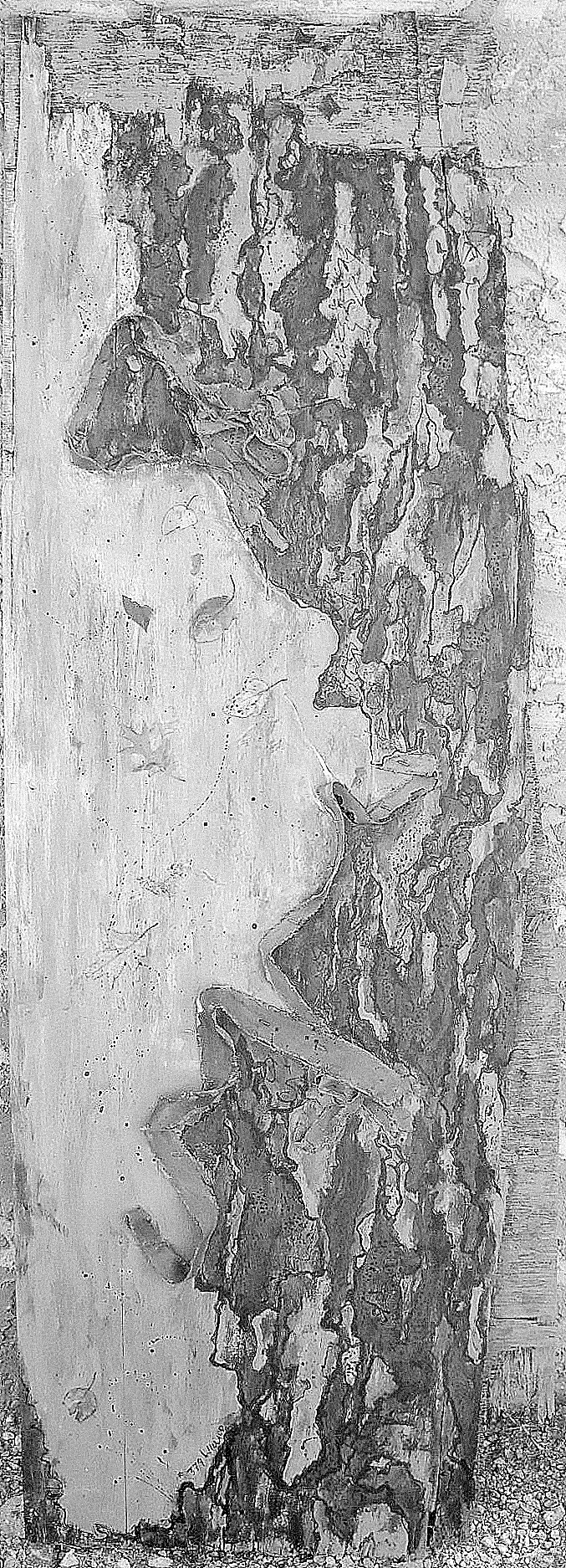 66×23″ Acrylic on weathered plywood, with leaves (I think I was channeling my Saturday morning “Trees of Fairmount Park field trip for this). I used strips trimmed from stretched canvases to define the borders.