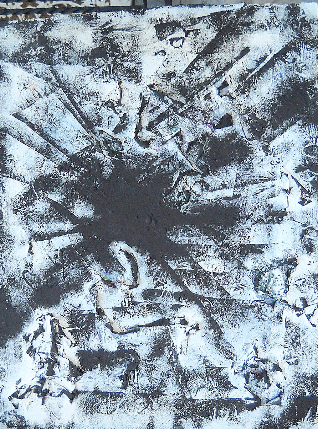 Smashed fast food container, found objects on plywood on Masonite. 23″ x 17″