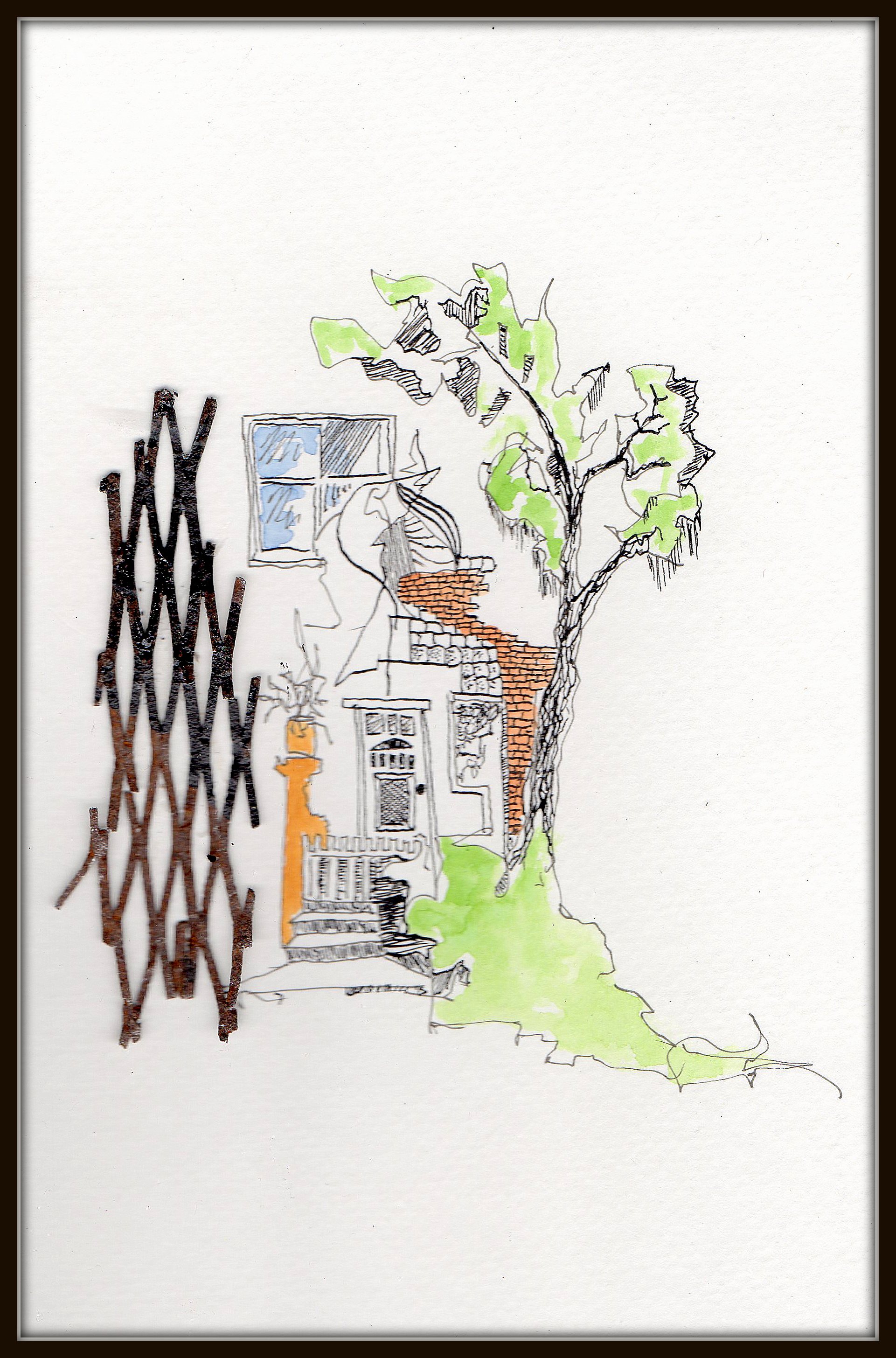 Urban sketch, Imaginary City 9.5″ x 7.% Ink, watercolor, rusted scrap