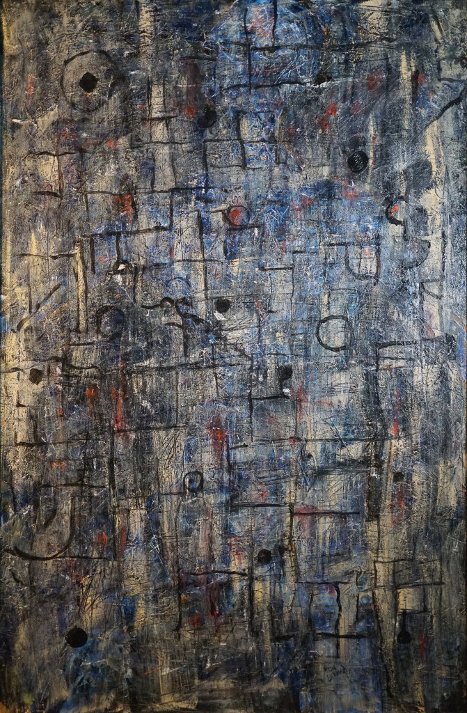 Have had this over my desk, and almost decided to use as a mount for watercolors… not happy with it. Looking at it for so long, I began to see some semi-geometric patterns. Reworked to make the visible, then was surprised to see a figure emerge. #1218 36x23inches. Oil on canvas. Ghost in the Machine.