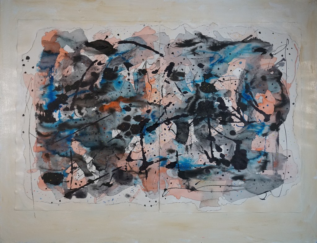 31″x40″ Two sheets Arches 140lb cold press mounted on stretched canvas. Watercolor, ink, acrylic.