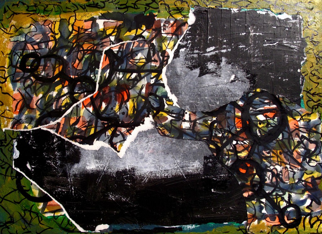 20″x27.5 Collage, Acrylic ink, watercolor, ink, mounted on stretched canvas.