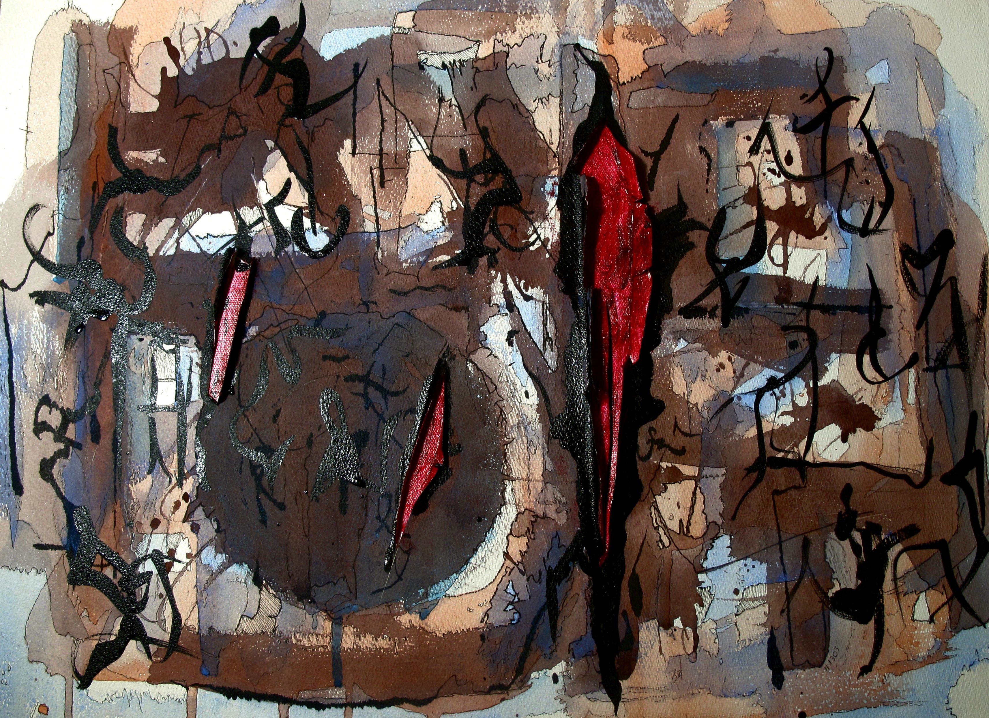 18x24inches Mixed Media: watercolor over acrylic ink, India ink, acrylic paint on Arches 140lb cold press mounted (and torn) on stretched canvas.
