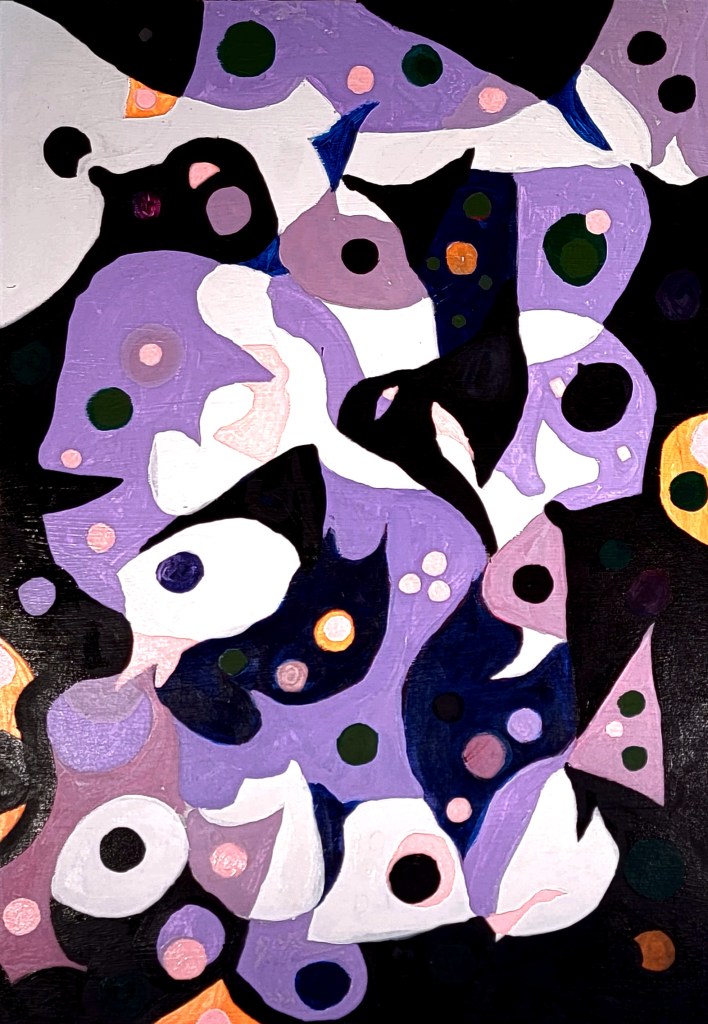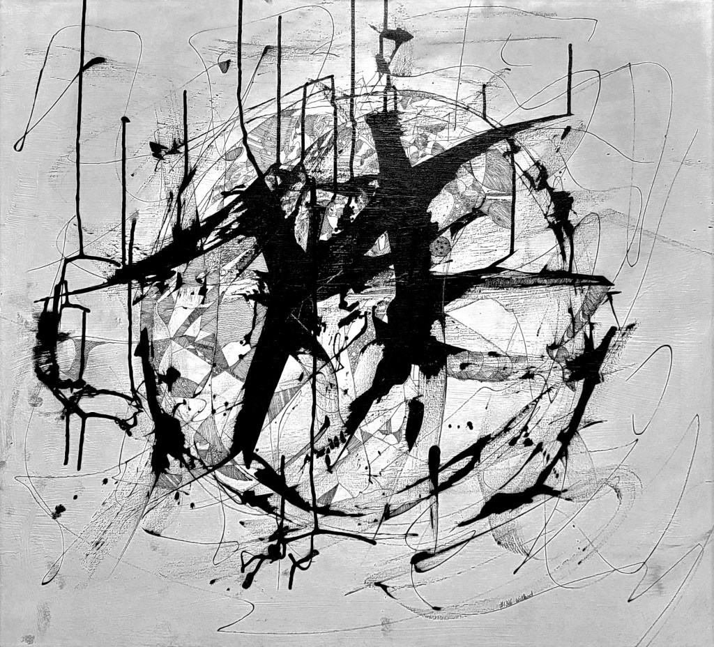 Acrylic paint, acrlic ink, brush and pen on stretched canvas. Photo by Brad Crothers.