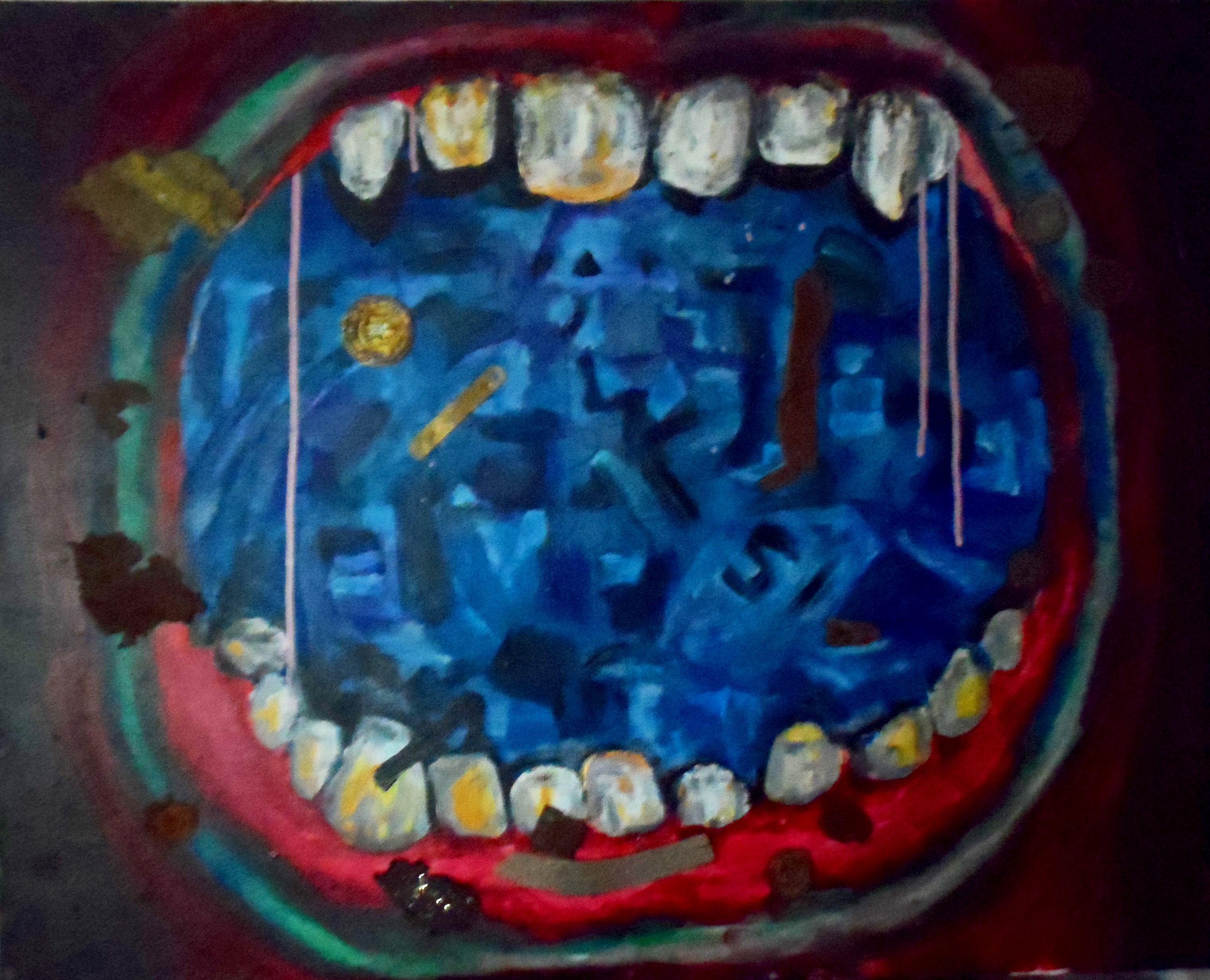 #1415 30″x24″ Acrylic and metal scraps on canvas. Title: words on bottle cap below left incisor. Rate this: