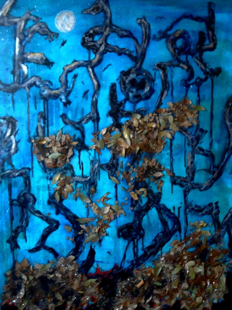 #1429 Palimpsest: What Rough Beast 48″x60″ Acrylic, collage of leaves and street dirt on canvas. Rate this: