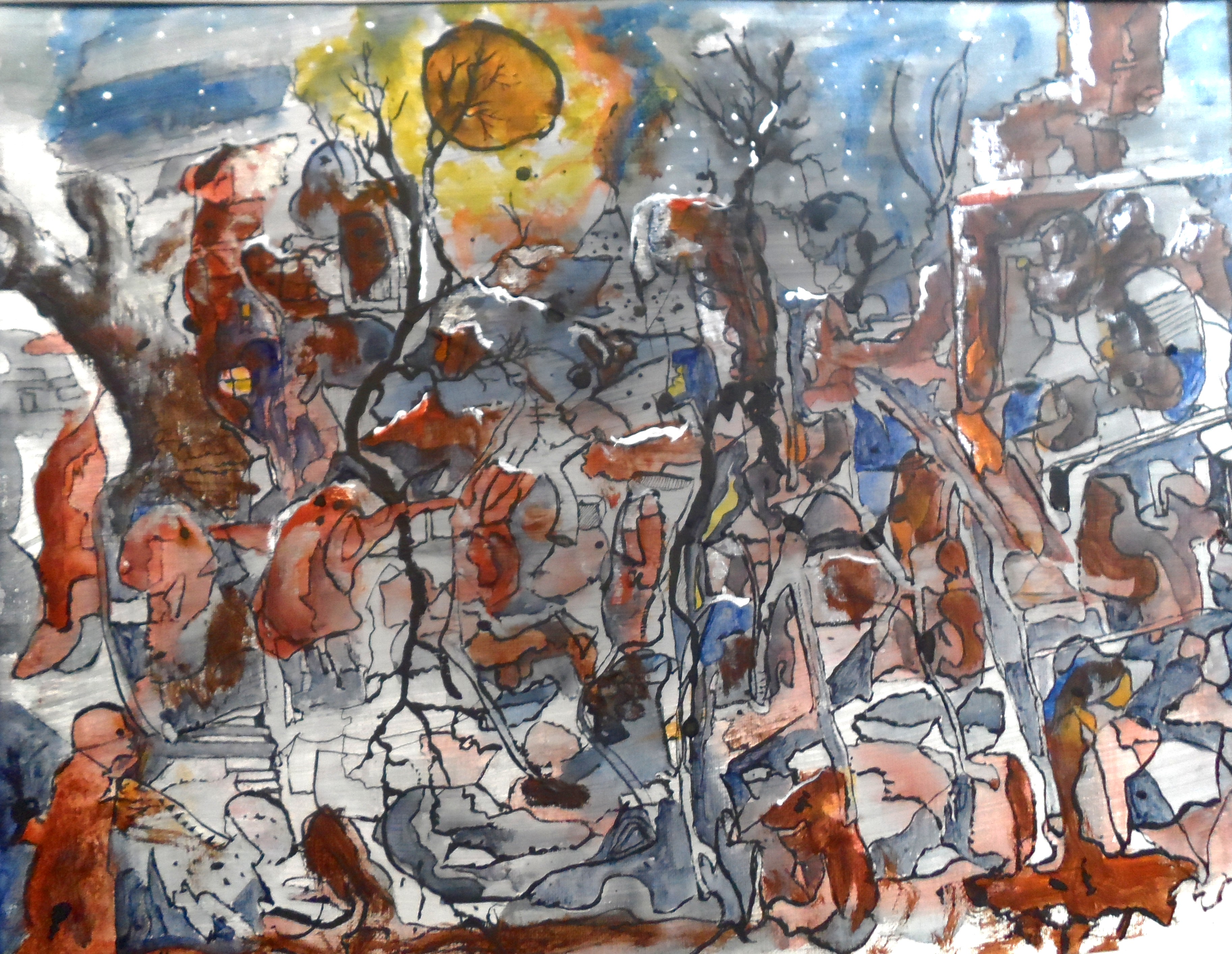 #1575 Snow on City of the Dead 16″x20″ Ink, Watercolor, acrylic on canvas Rate this:Share this: Share on X (Opens in new window) X Share on Facebook (Opens in new window) Facebook More Share on Tumblr (Opens in new window) Tumblr Share on Pinterest (Opens in new window) Pinterest Like Loading... Related