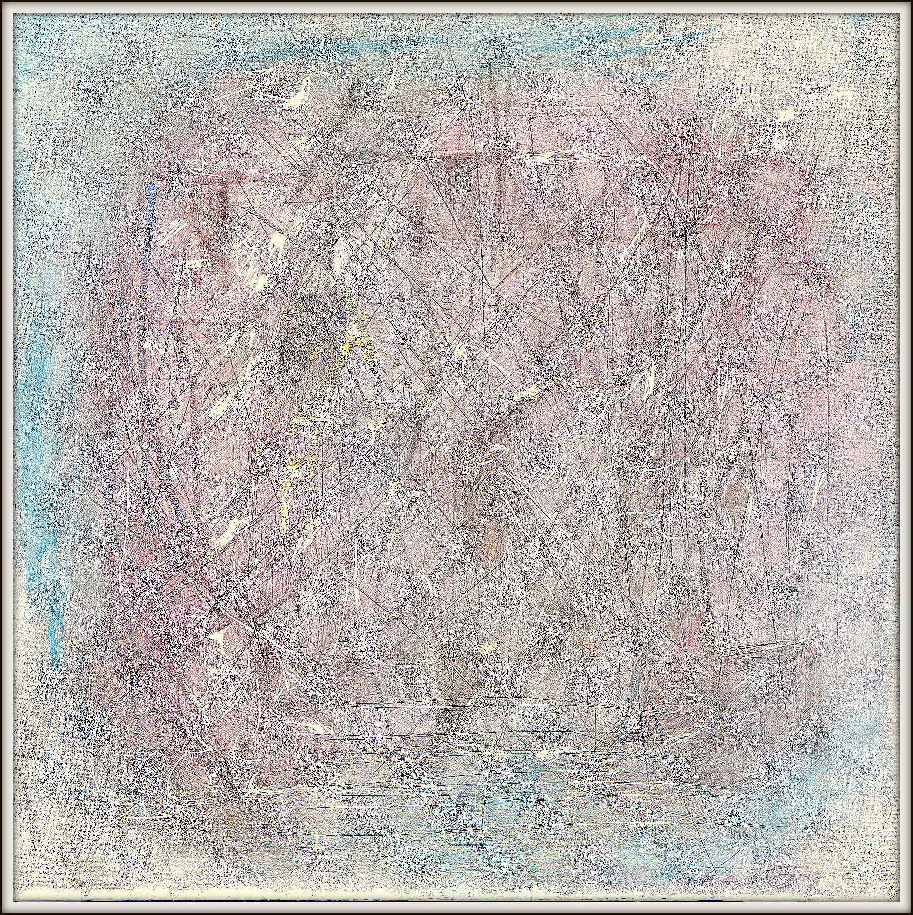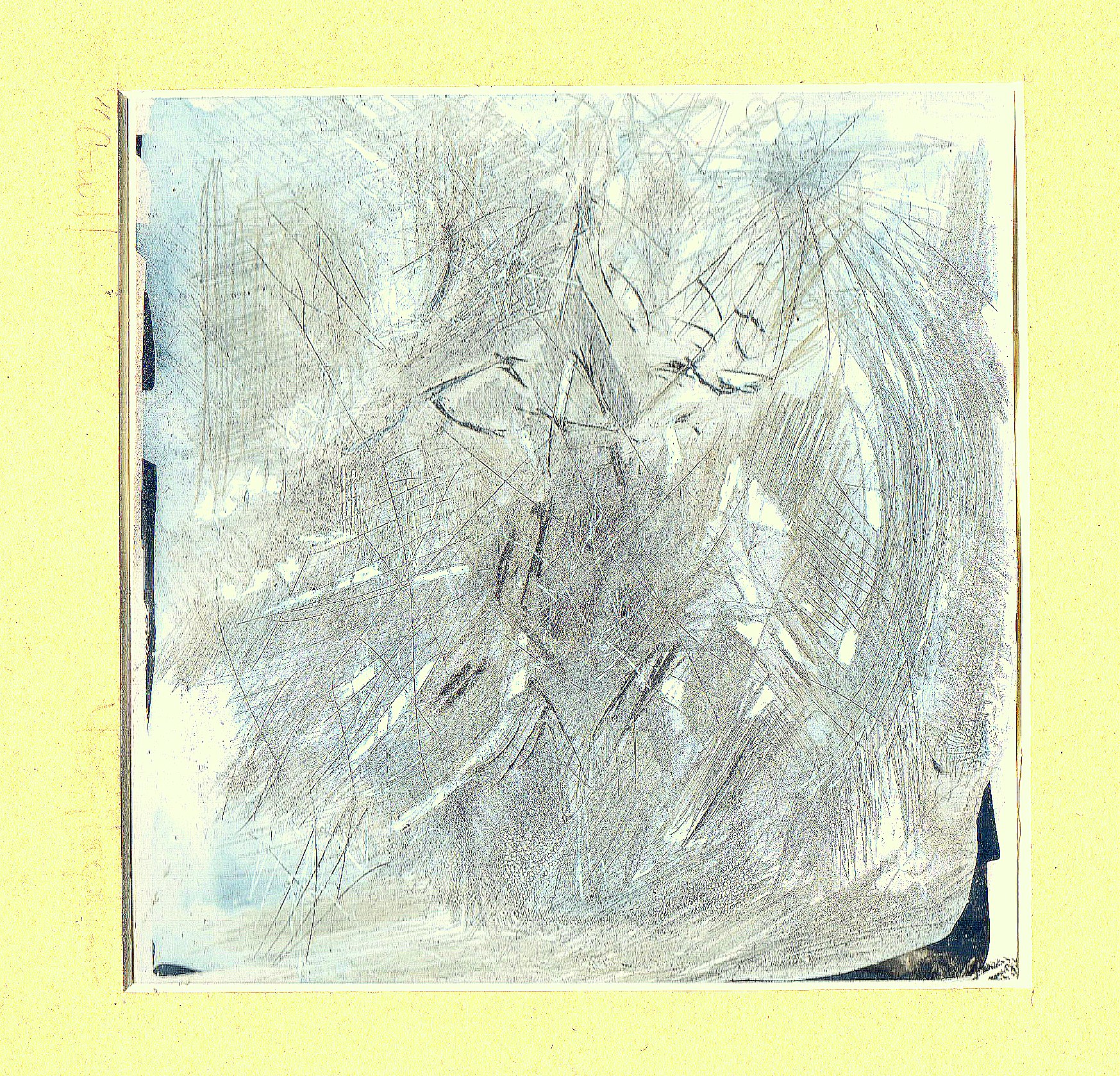 4.5″ x 4.5″ Silver, gold, aluminum, white gel pen, scratch through to dark ground.