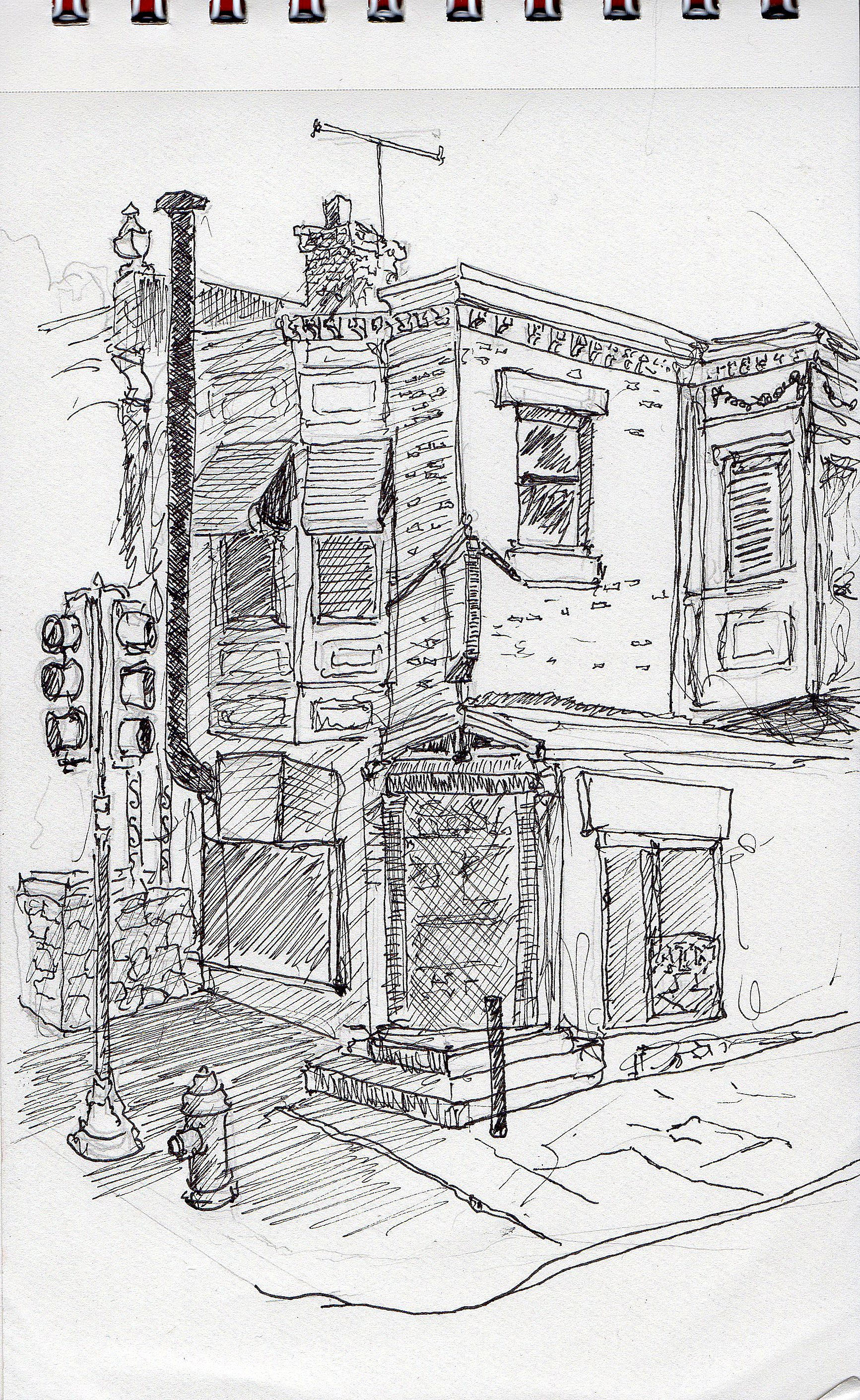 54th & Pine, Philly. Not very good at this yet… gonna take a while, but spending an hour or two drawing has the same effect for me as meditation. And it raises the level of my attention– to everything I see. Nothing like it. Eyeballing this, unless you have architectural perspective training, is not easy. I do use perspective guidelines, but complex structures are a challenge… like the fucking oriel bays so common in West Philly. Every bay has two additional vanishing points, besides the right angle facades of the building, and while the upper vanishing point can be ignored with two or three story buildings, unless you’re drawing them from close up, the bays bring that into play too… cause if eye level is sitting or standing above the street–you’re seeing the bottom of those bays. Makes pretty simple buildings, quite complex, figuring out the perspective.
