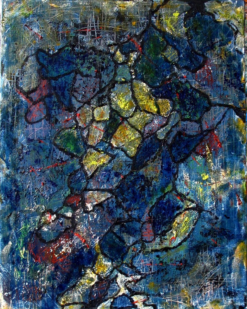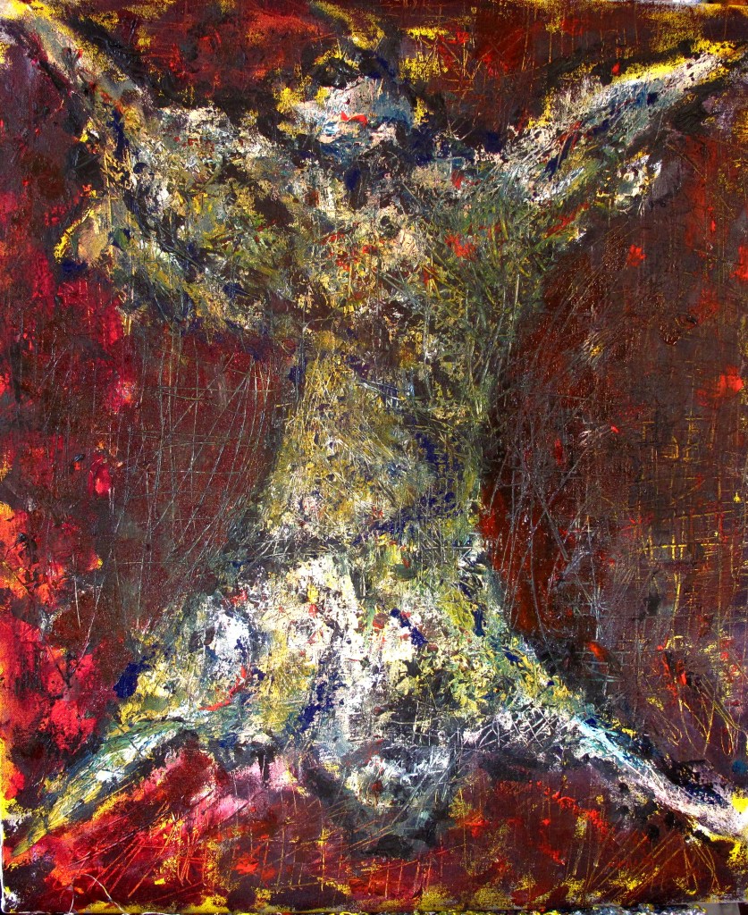 I pulled this from the basement, thinking I’d paint-over it, but seemed worth saving. I added hand prints–which I’d thought about doing when I made it. So this is 2015 to 2019 vintage. 25″ x 29″ (63×73) Acrylic on canvas
