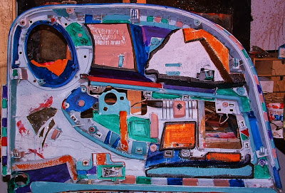Trash assemblage, Found Art. The back side of a breaker box, rusted steel mounted on 16×20 canvas board–untouched. Look closely at this and tell me– how are my ink and watercolor ‘abstractions,’ not drawn as much from nature as any landscape or still life?