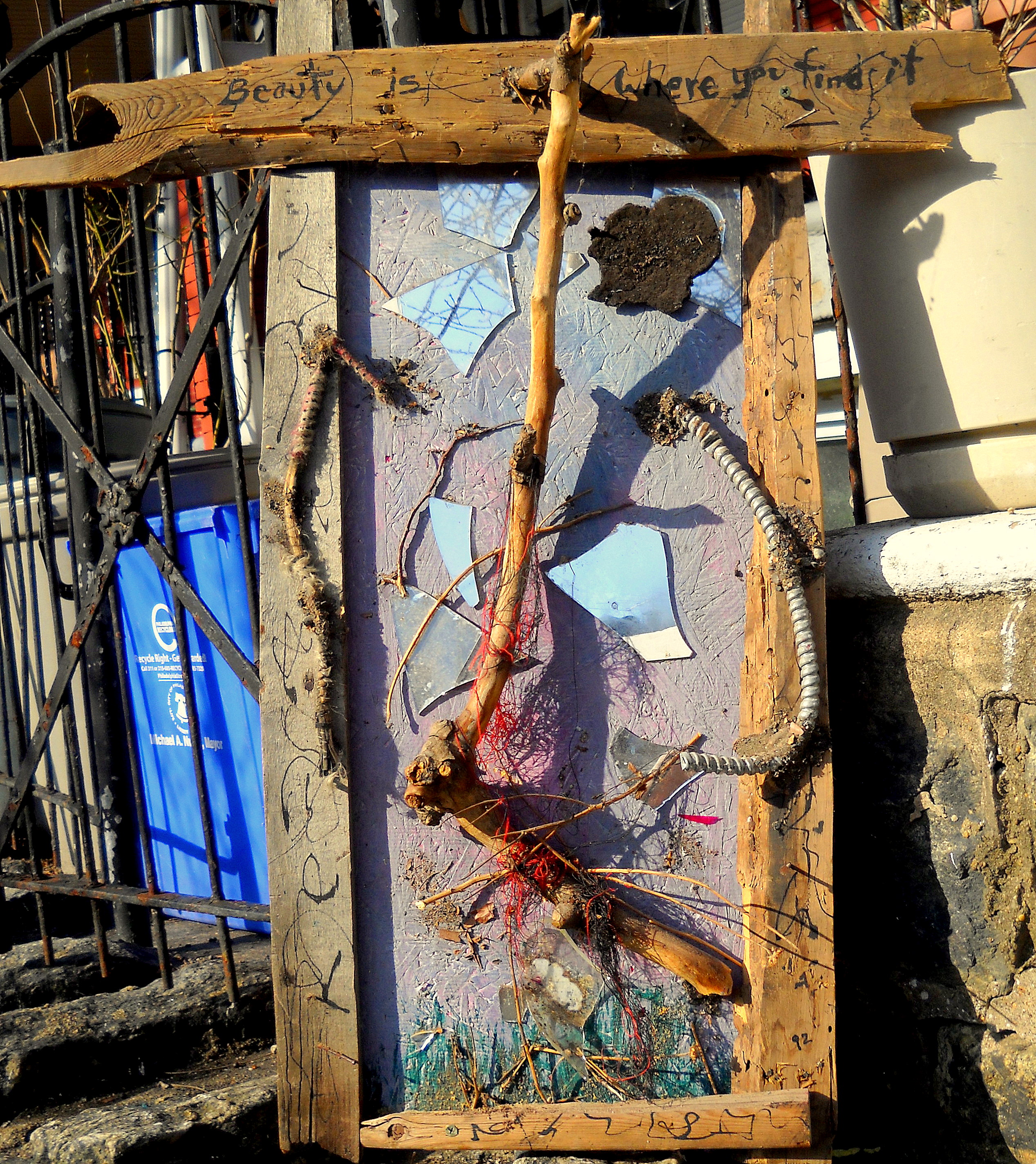 Another older piece, an assemblage of debris found on the street around the Ox, the collective warehouse in Kensington, where I lived in 2012. This isn’t a celebration of decay–but of what I imagine we must do: reclaim from the ruins of capitalism, a vision for a new world!