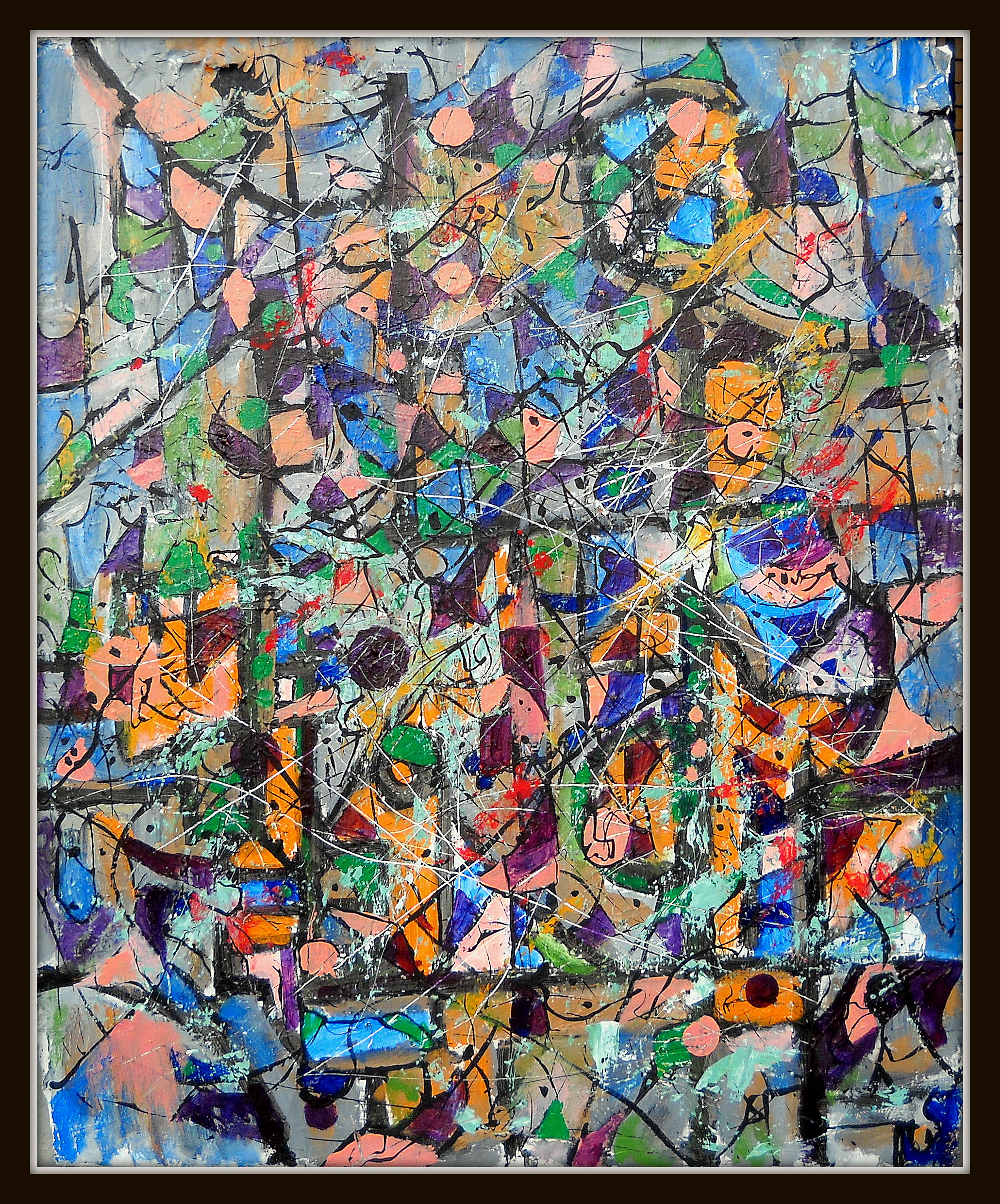 31″ x 24″ Acrylic on Masonite. Not sure I’ve reached the end of this ‘kaleidoscope’ series, or pushing on to a new phase. I started out with some heavy, black bars, horizontals and verticals and connecting beams; the idea was to devise a scaffold, like beams of a building with the walls torn down–but again, like related paintings, giving the illusion of depth through layering, not geometric perspective.